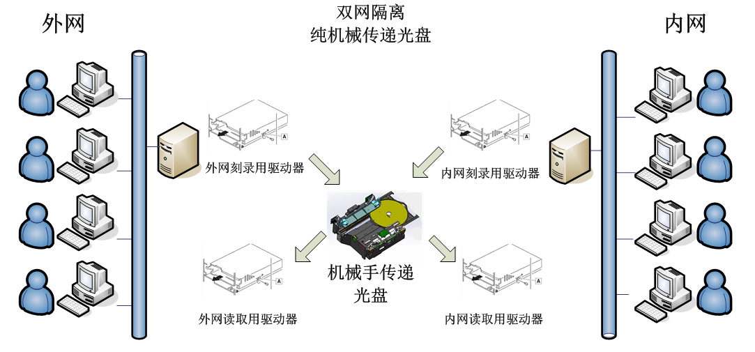 “双网物理隔离光盘信息交换系统”基于机电一体化技术,利用机械手模拟人手工操作光盘进行数据自动迁移,实现外部网络与内部网络间的物理隔离,为网间交换数据提供一种自动化的、安全可靠的解决方案。